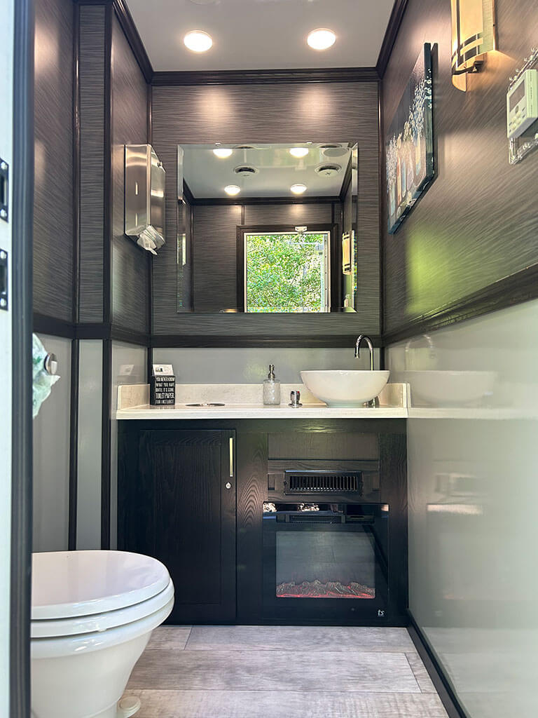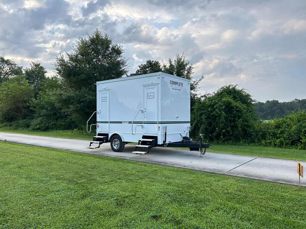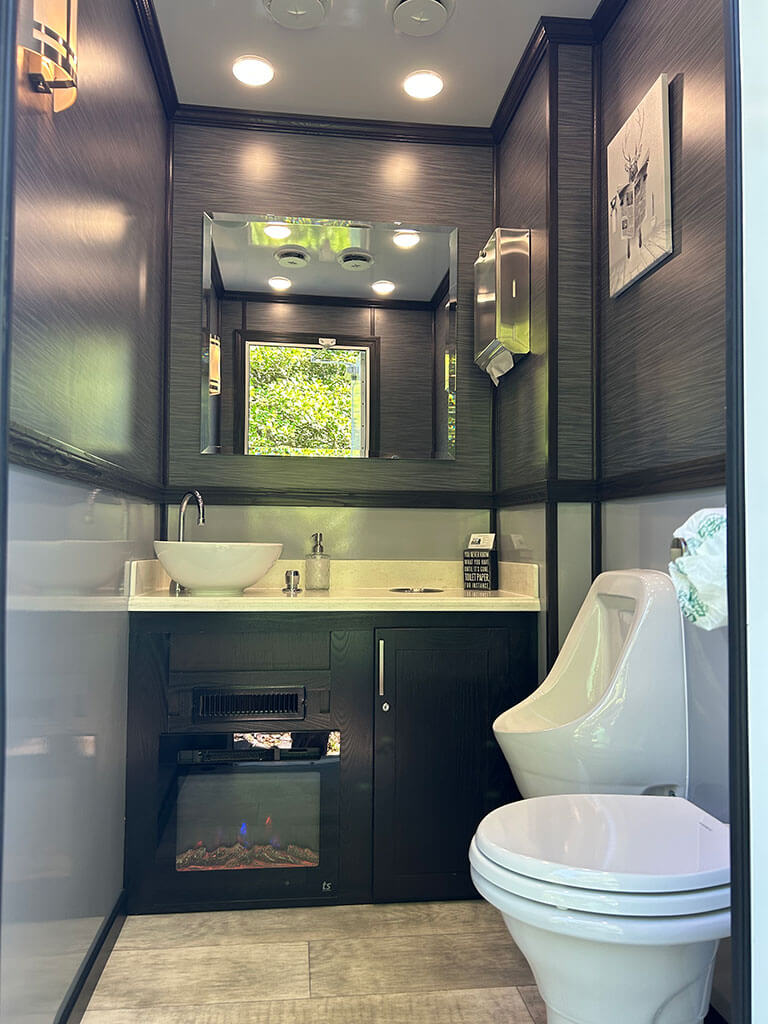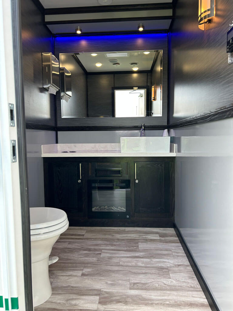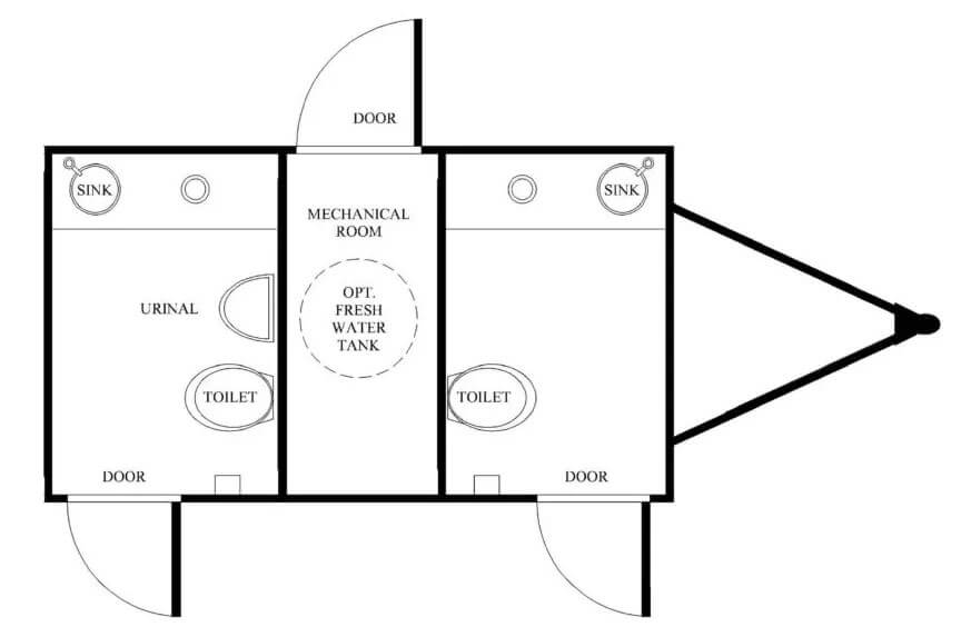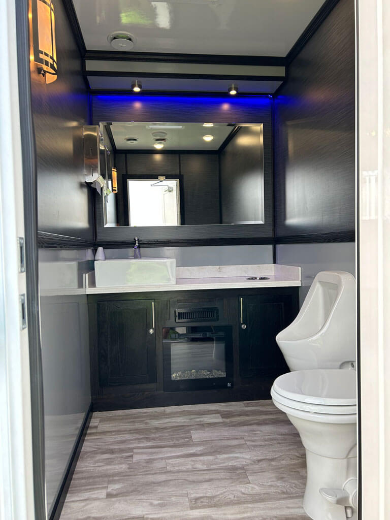 The 2-station restroom trailer is our most sought-after option, blending elegance with practicality. Its sophisticated, streamlined design seamlessly complements weddings, family reunions, and corporate events, ensuring it remains a tasteful addition rather than an eyesore. The tow-behind feature allows for effortless placement at your desired location, providing unparalleled convenience. The private women’s stall boasts a vanity with sink, a mirror, and a flushable toilet. The private men’s stall has a vanity with sink, a mirror, flushable toilet, and a urinal. These features help ensure a luxurious standard of cleanliness and comfort.