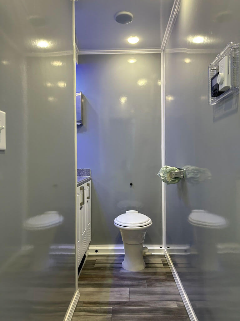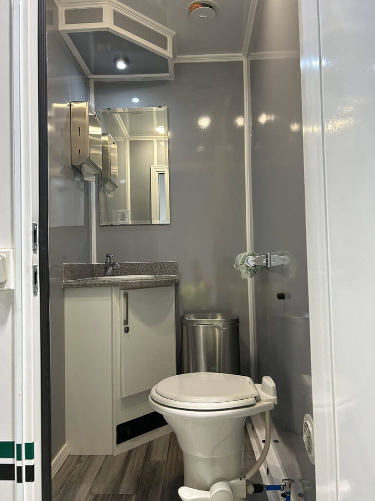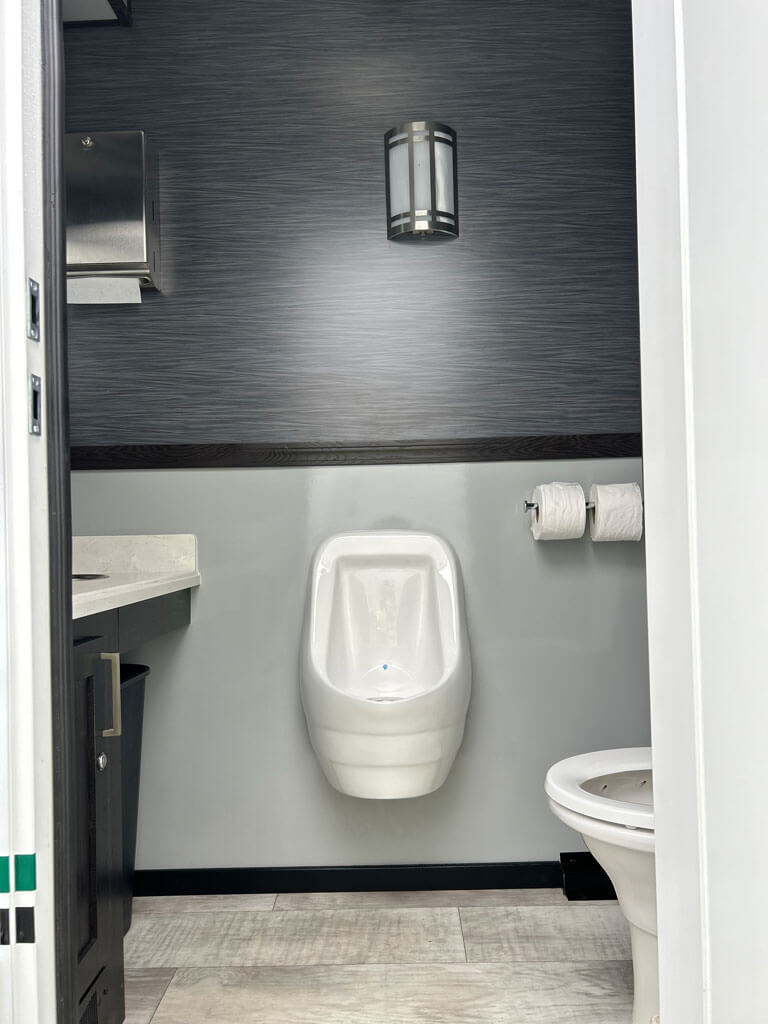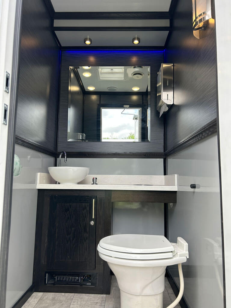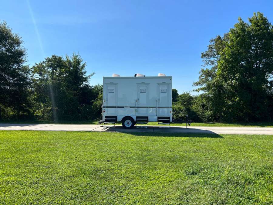 Our 4-station restroom trailer represents the pinnacle of opulence and exclusivity. It boasts four private, lavish restrooms designed to offer your guests unparalleled comfort and sophistication. Though compact in design, it exudes spacious elegance, making it perfect for grand family celebrations, elite corporate functions, or luxurious weddings. Adorned with flushable toilets, refined sinks with flowing water, and chic vanities, every detail is meticulously crafted. Three of the stalls feature both a toilet and sink, while the fourth includes an additional urinal, ensuring every need is met with the utmost convenience. This trailer is the quintessential choice for those seeking a truly extravagant and high-end restroom experience.