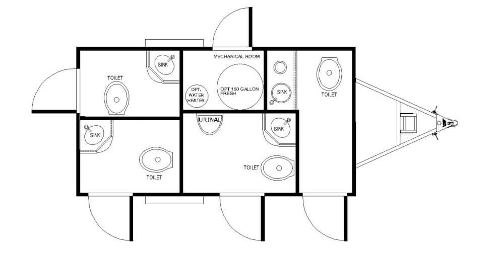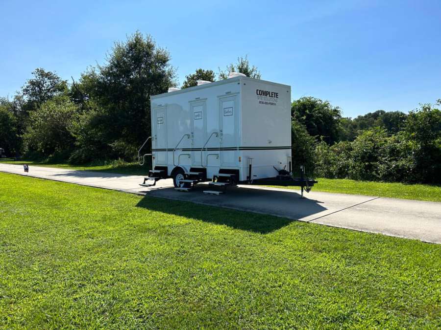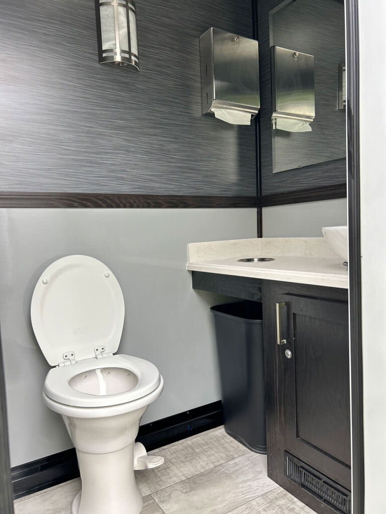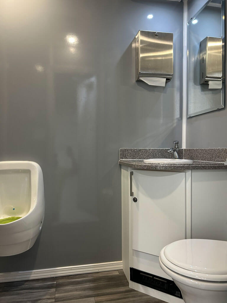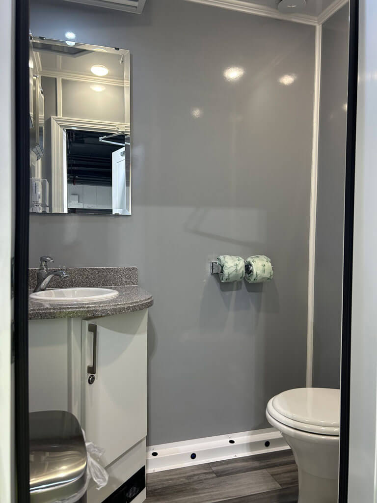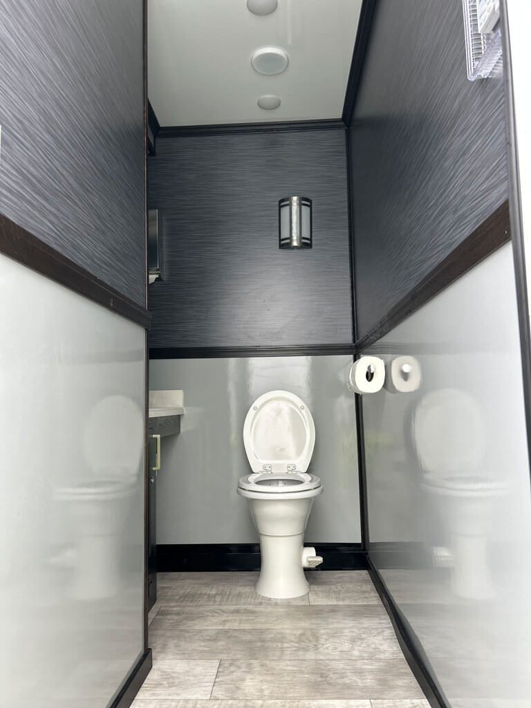Our 4-station restroom trailer represents the pinnacle of opulence and exclusivity. It boasts four private, lavish restrooms designed to offer your guests unparalleled comfort and sophistication. Though compact in design, it exudes spacious elegance, making it perfect for grand family celebrations, elite corporate functions, or luxurious weddings. Adorned with flushable toilets, refined sinks with flowing water, and chic vanities, every detail is meticulously crafted. Three of the stalls feature both a toilet and sink, while the fourth includes an additional urinal, ensuring every need is met with the utmost convenience. This trailer is the quintessential choice for those seeking a truly extravagant and high-end restroom experience.